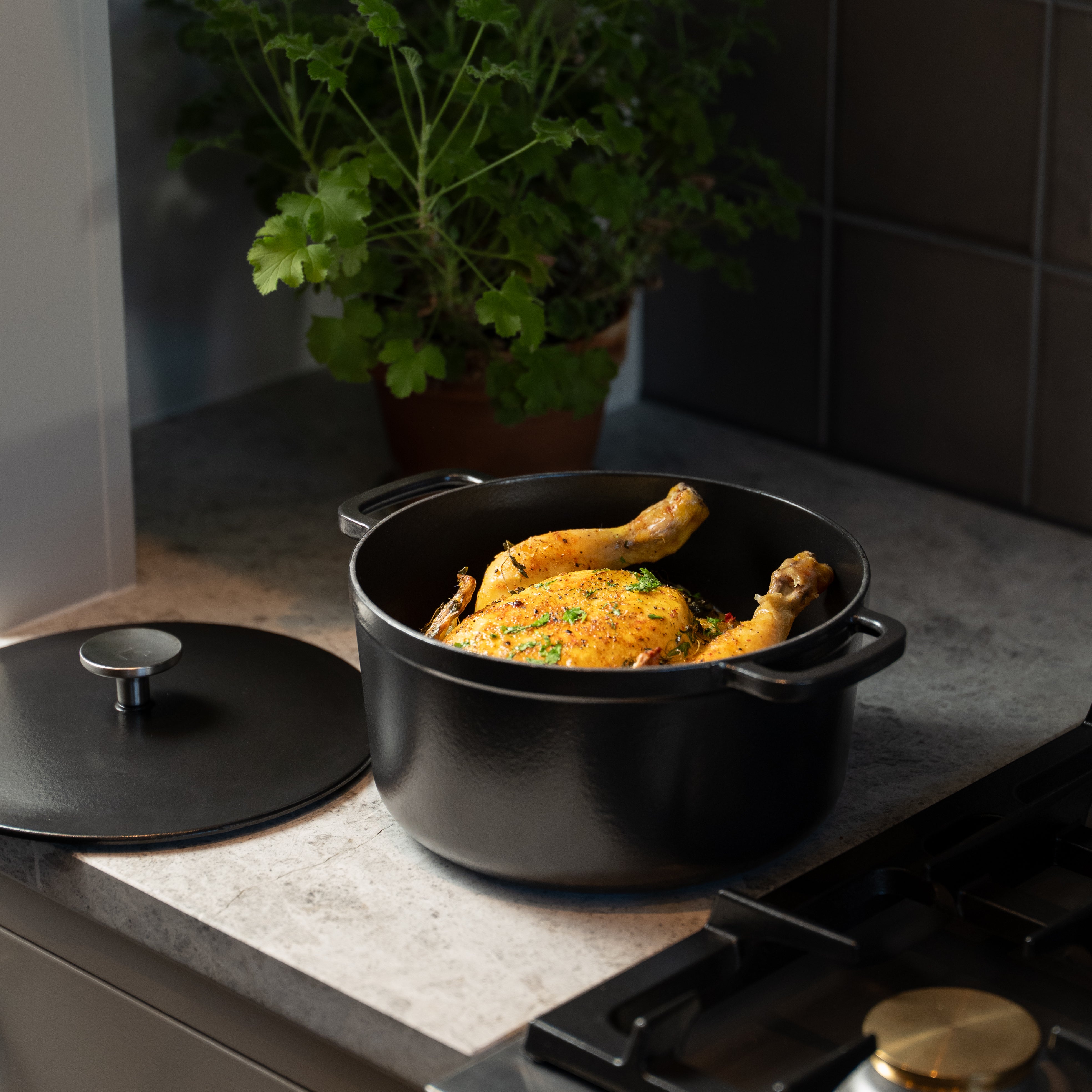 Die Dicke des Gusseisentopfs sorgt für die perfekte Balance zwischen Temperaturkontrolle und Wärmespeicherung. Das Gusseisen speichert die Wärme, sodass Sie fantastische Krusten erzielen und gleichzeitig weniger Energie verbrauchen, wenn Ihr Gulasch lange köcheln muss. Sie können die Wärmespeicherung auch nutzen, um Ihre Speisen beim Servieren länger warm zu halten. Verwenden Sie dieses vielseitige Küchengerät zum Braten, Köcheln, Schmoren, Backen und Dämpfen – natürlich ohne das Risiko von PFAS und Schwermetallen in Ihren Speisen.