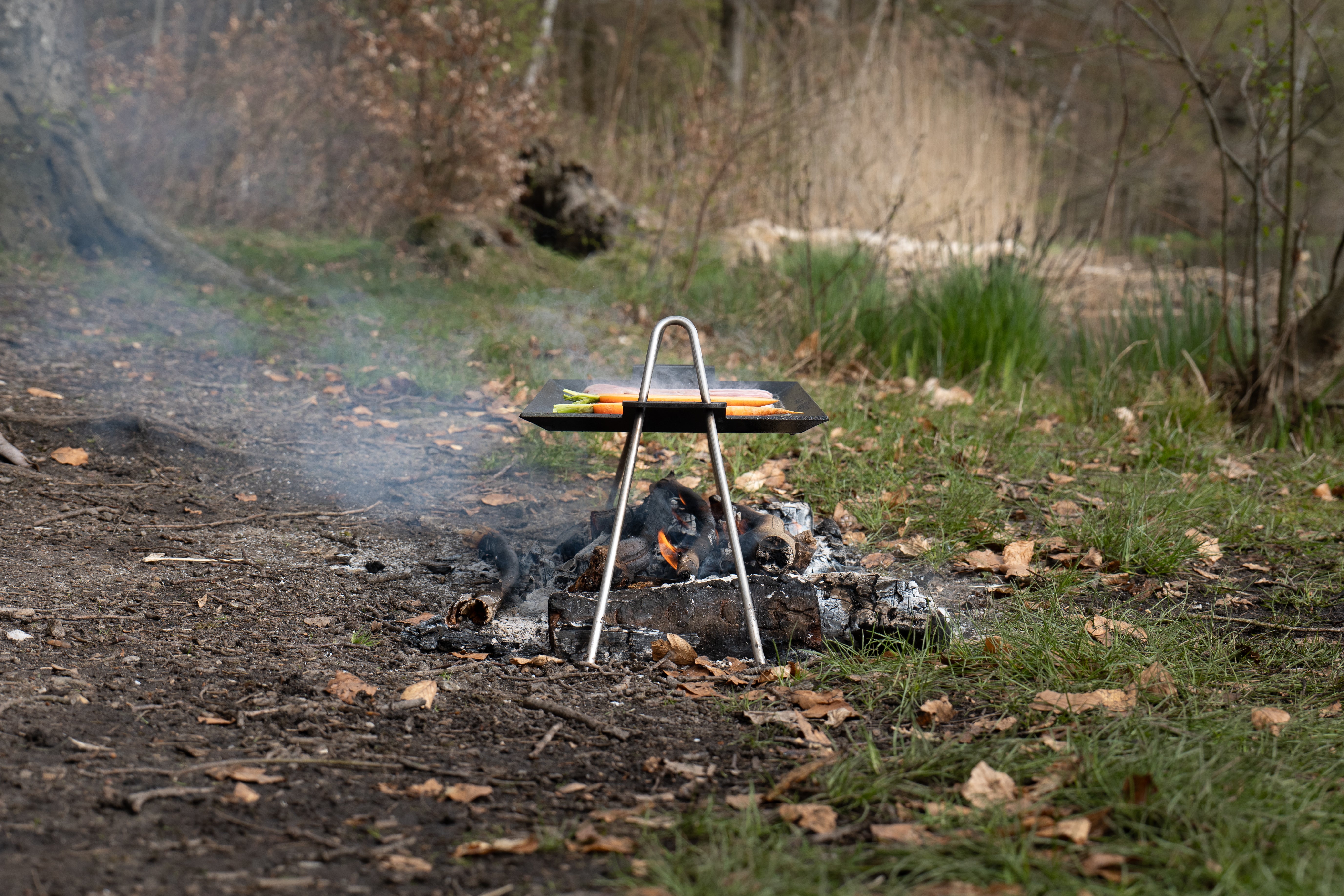 Im Gegensatz zu einer gerippten Grillpfanne bietet die Grillplatte eine maximale Kochfläche – und mit dem Smasher erhöhen Sie den Kontakt zwischen Ihren Zutaten und der Platte, um perfekte Ergebnisse zu erzielen, sei es bei der Zubereitung von Smash-Burgern, perfekt flachem Speck oder Toasts. Die Anwendung ist einfach: Stellen Sie den Feuerständer und die Grillplatte auf, entzünden Sie Ihr Feuer und kochen Sie direkt auf der Grillplatte – oder verwenden Sie die Grillplatte als mobilen Herd für Ihren Topf.