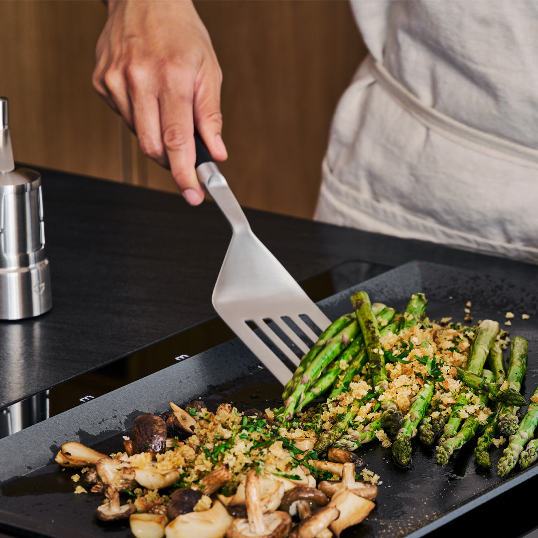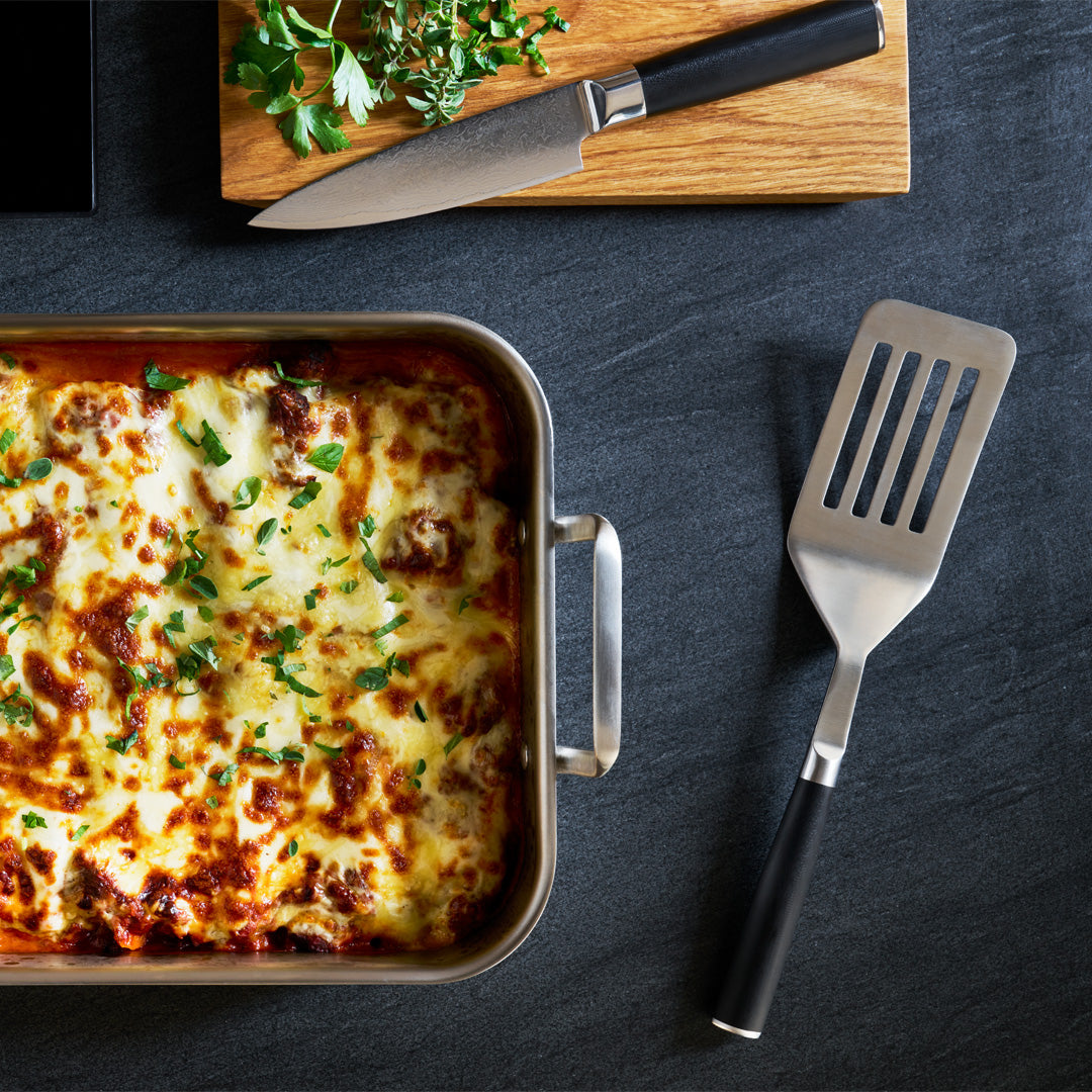Perfekt zum Wenden von Spiegeleiern bis hin zu Ribeye-Steaks. Mit seiner dünnen Vorderkante und ergonomischen Silhouette ist der Spatel auch das ideale Werkzeug zum Schneiden von Lasagne oder zum Wenden von Steaks auf der Grillplatte.