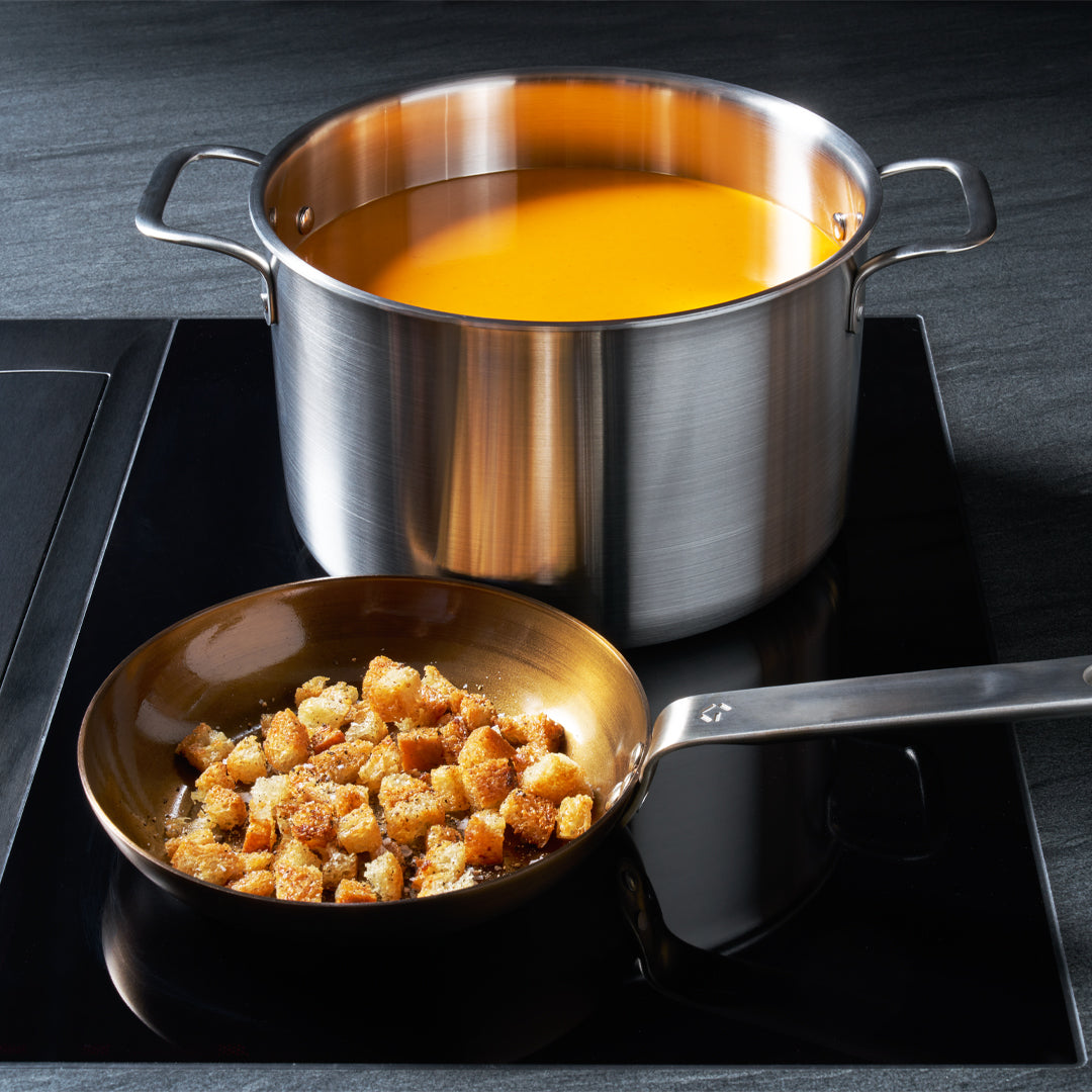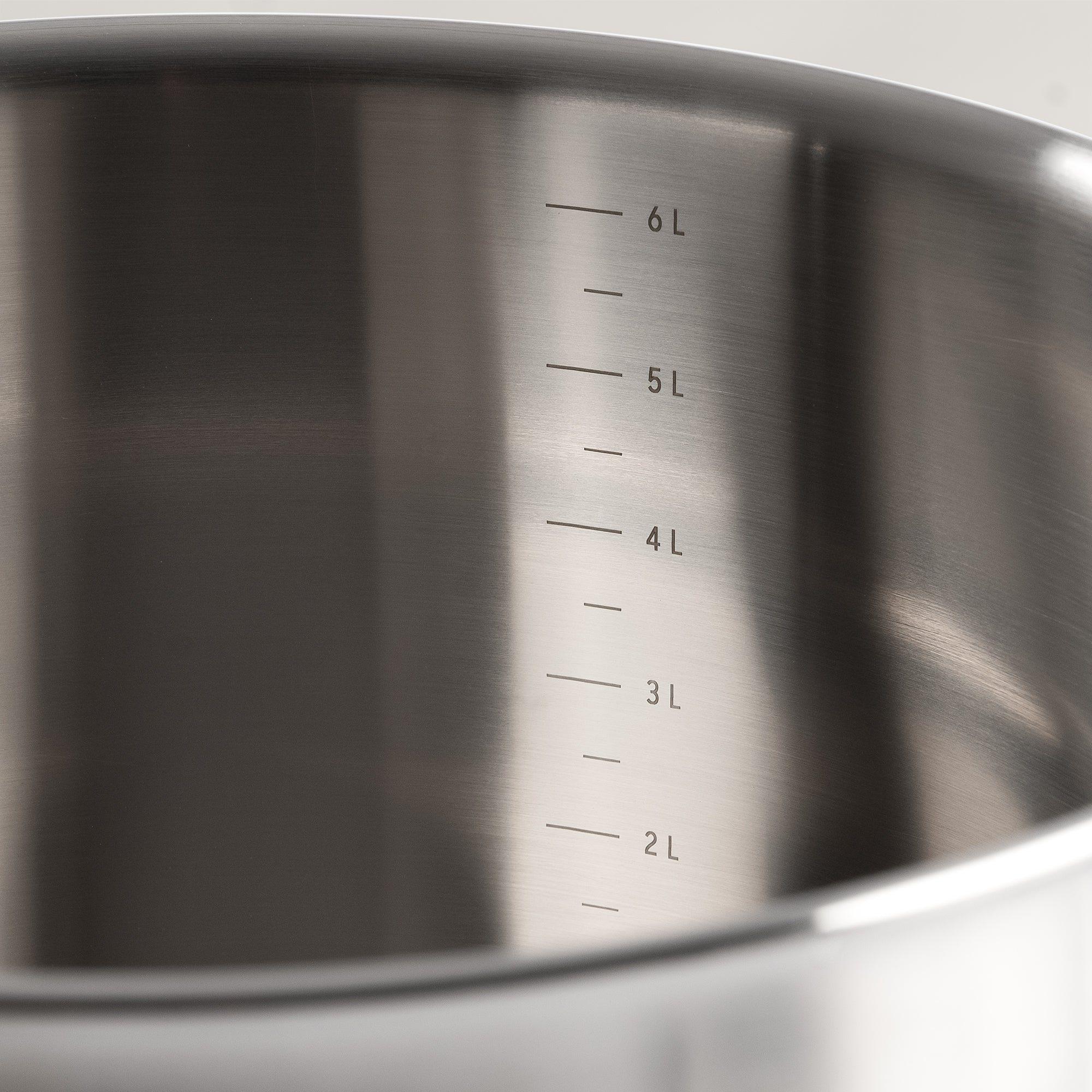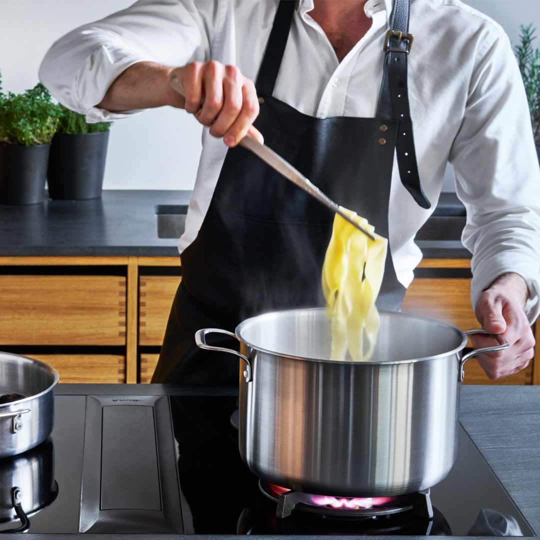 Dank des Aluminiumkerns mit hervorragender Wärmeleitung lässt sich die Hitze präzise steuern und die Temperatur schnell anpassen. Im Gegensatz zu Kochgeschirr mit aufgesetztem Sandwichboden breitet sich die Hitze auf natürliche Weise an den Seiten des Topfes aus, da der gesamte Topf aus einer 5-lagigen Konstruktion besteht - perfekt für Gerichte wie Risotto und langsam gekochte Rezepte.