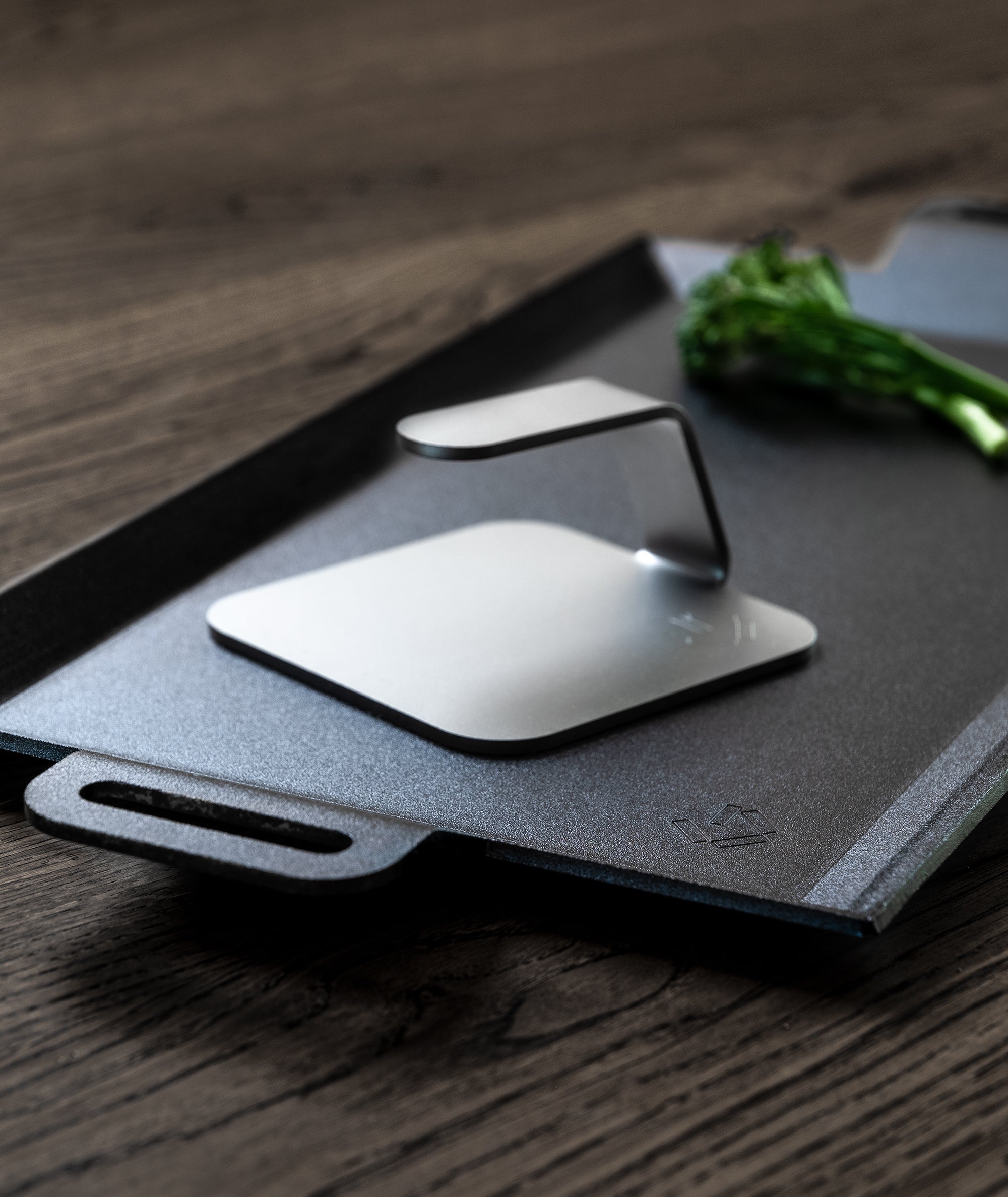 Unsere Smasher/Grillpresse aus Edelstahl ist perfekt auf unsere Grillplatte aus Kohlenstoffstahl abgestimmt und erhöht den Kontakt zwischen Ihren Zutaten und der Kochfläche – was perfekte Ergebnisse garantiert, egal ob Sie Smash-Burger, perfekt flachen Speck oder Toasties zubereiten.