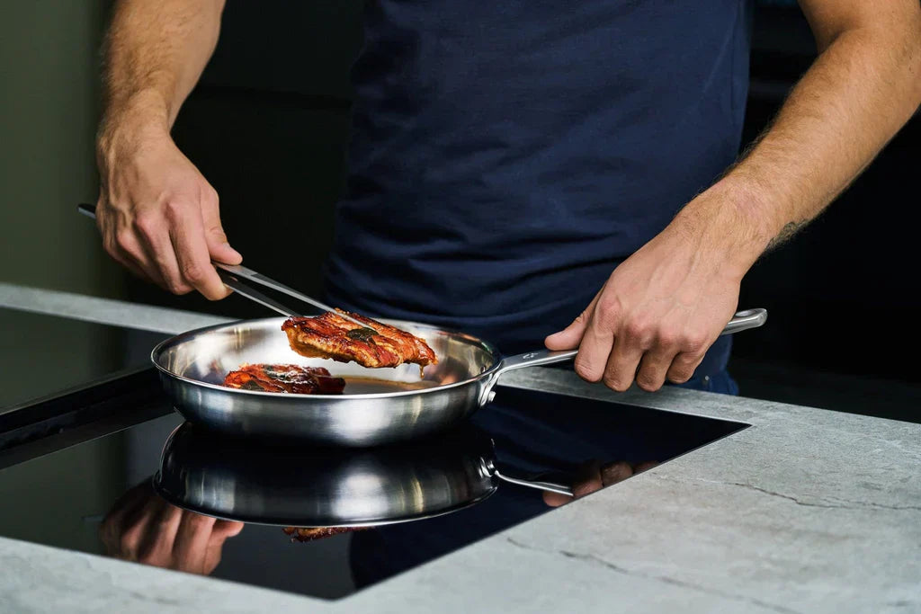 Mit der 5-lagigen Konstruktion erhalten Sie eine unverwüstliche Bratpfanne, die ein Leben lang hält, und alle Vorteile von Edelstahl: geringer Pflegeaufwand, für alle Arten des Kochens geeignet und völlig frei von PFAS und anderen schädlichen Beschichtungen, die sich mit der Zeit abnutzen und in Ihre Lebensmittel gelangen.
